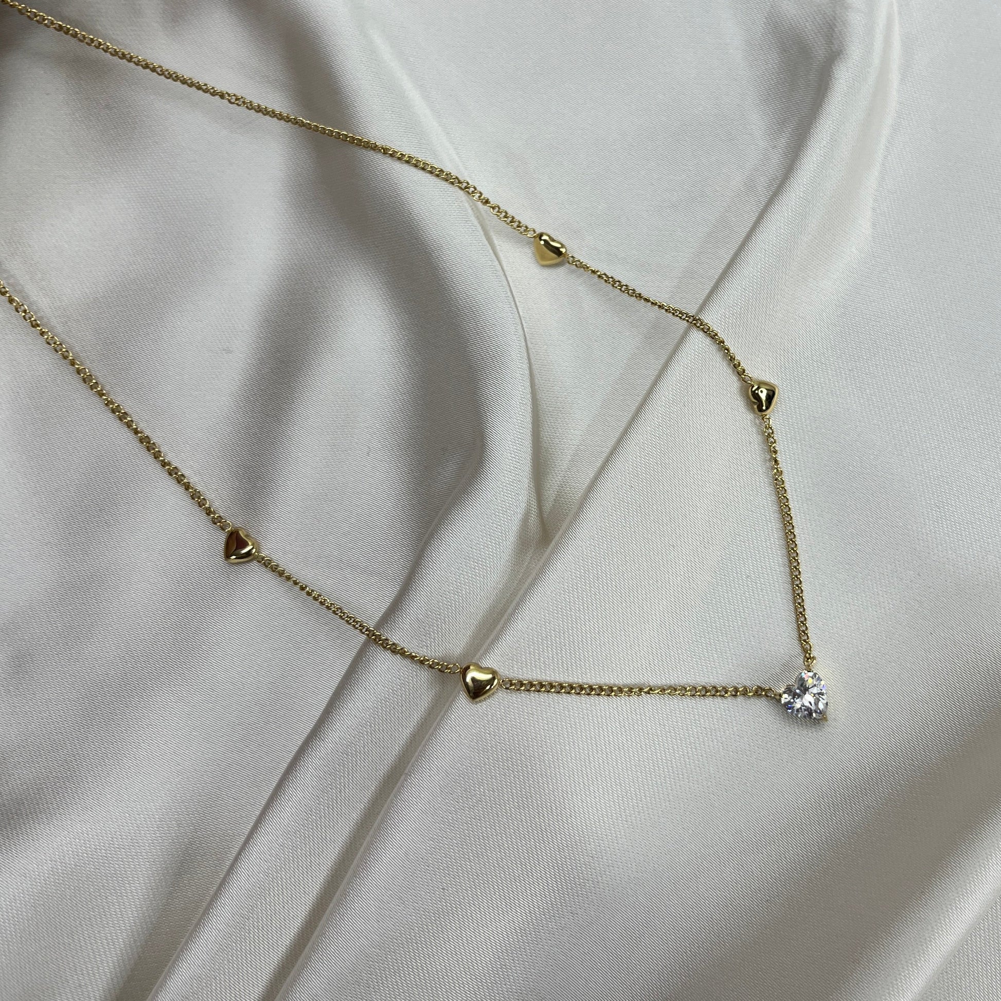 A radiant heart-cut crystal framed by mini gold hearts along a fine chain—celebrating love’s sparkle and golden devotion.