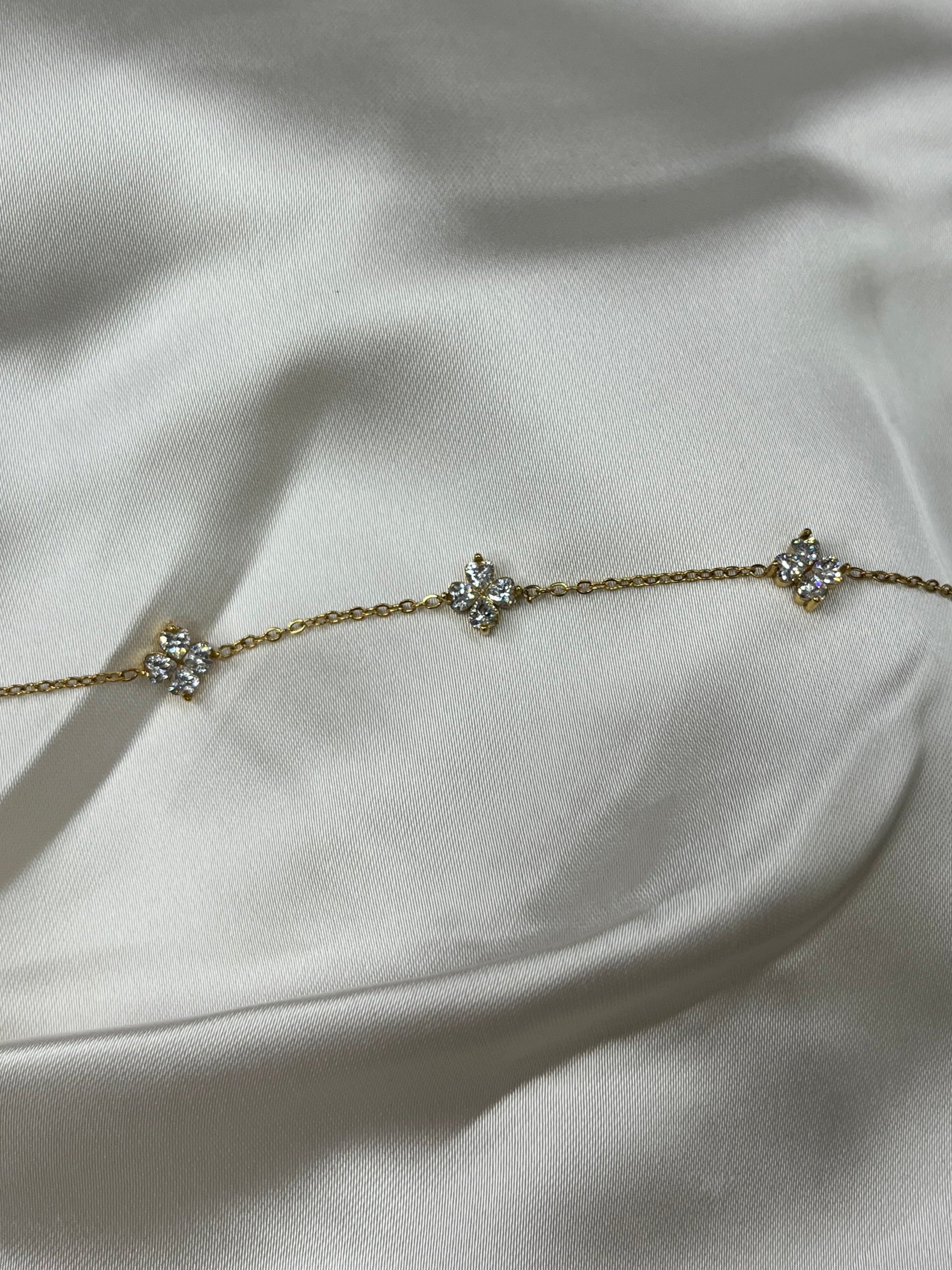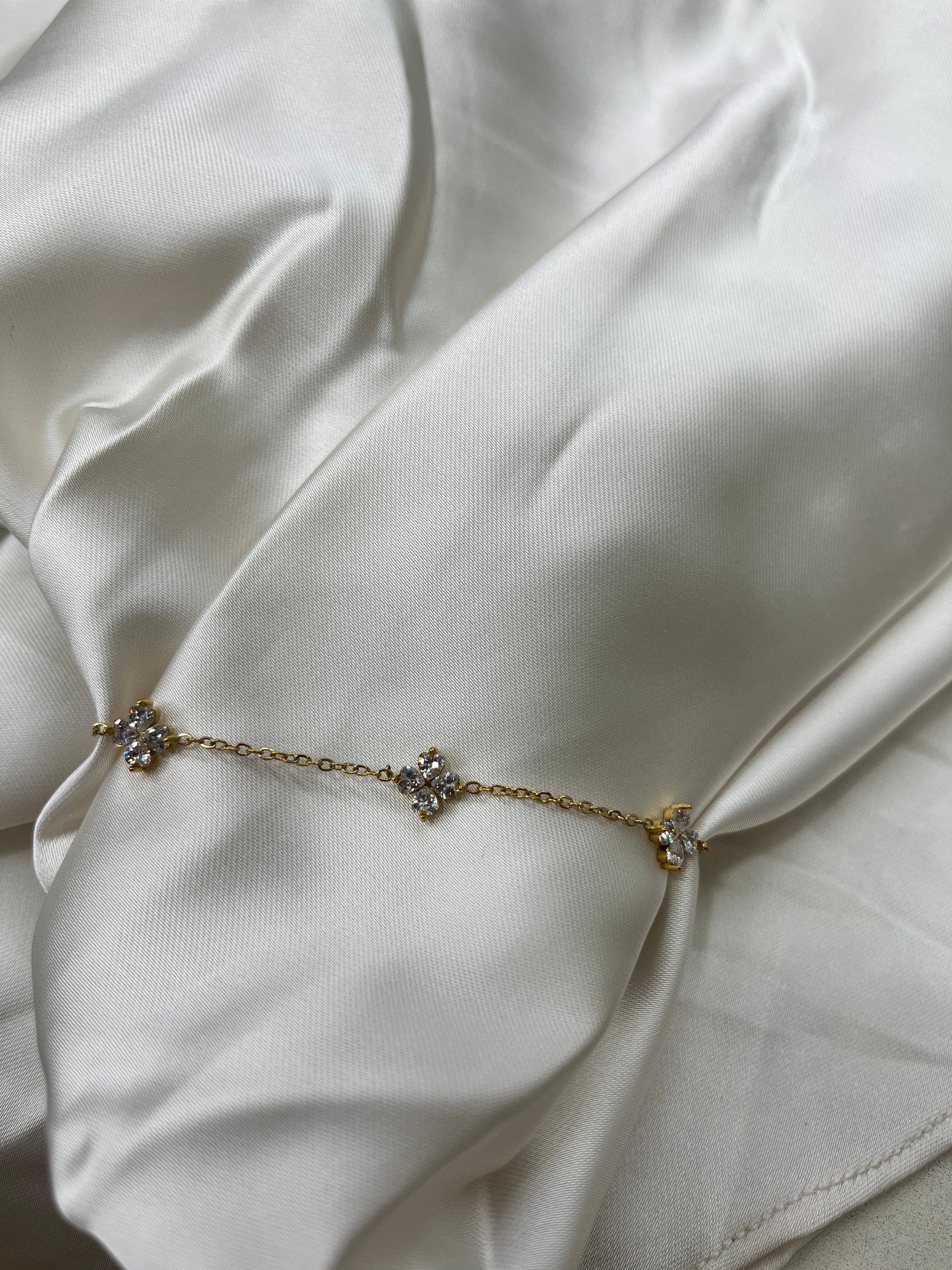 Delicate gold chain bracelet with three floral crystal clusters — dainty, feminine, and perfect for subtle elegance.
